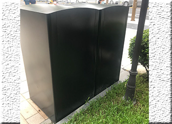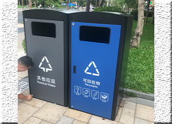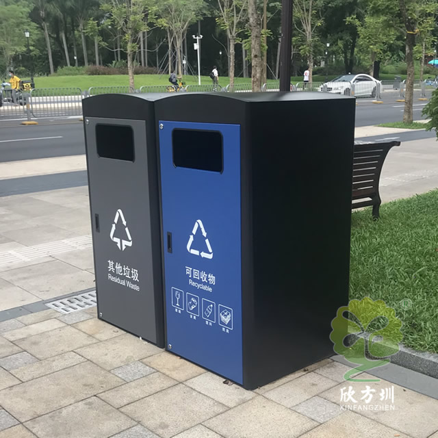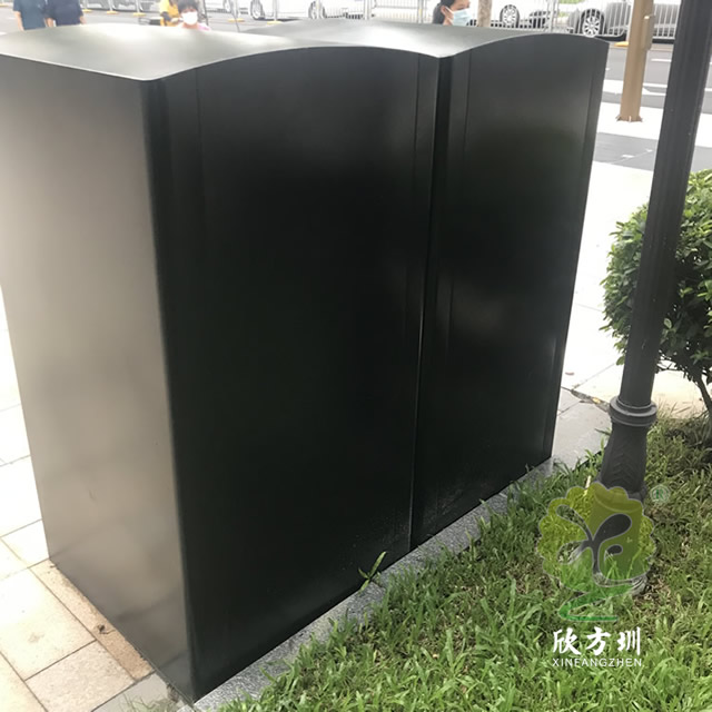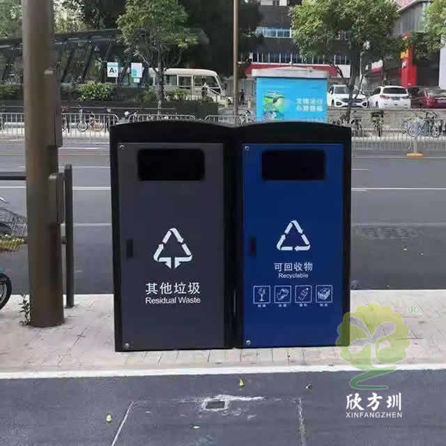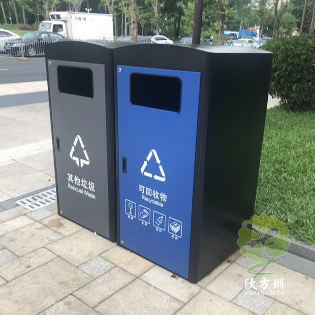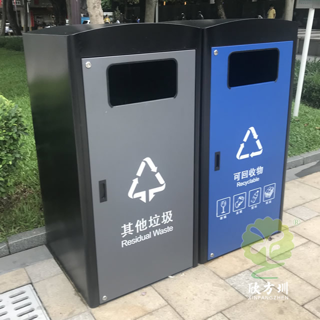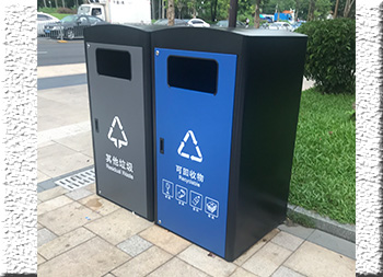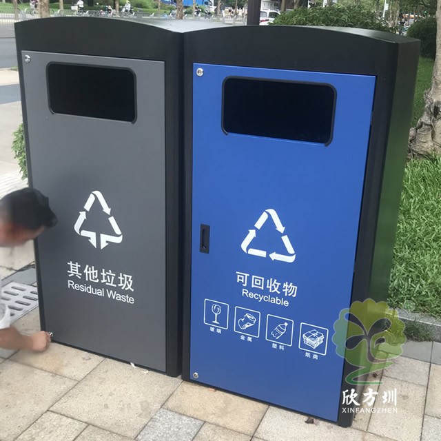 深圳市政道路240升兩分類箱體套桶桶罩這款垃圾桶是深圳福田市政道路的垃圾桶,現(xiàn)在深圳很多城區(qū)都在生產(chǎn)這款桶罩,方形組合式兩分類設(shè)計(jì),整體表面黑色噴涂噴塑,其他垃圾門板噴塑了灰色,可回收物噴塑了藍(lán)色,門板絲印了分類標(biāo)識,一門上下兩把鎖頭中間位置帶把手,內(nèi)筒是放置240塑料垃圾桶的內(nèi)膽所以叫“桶罩”。