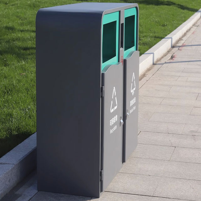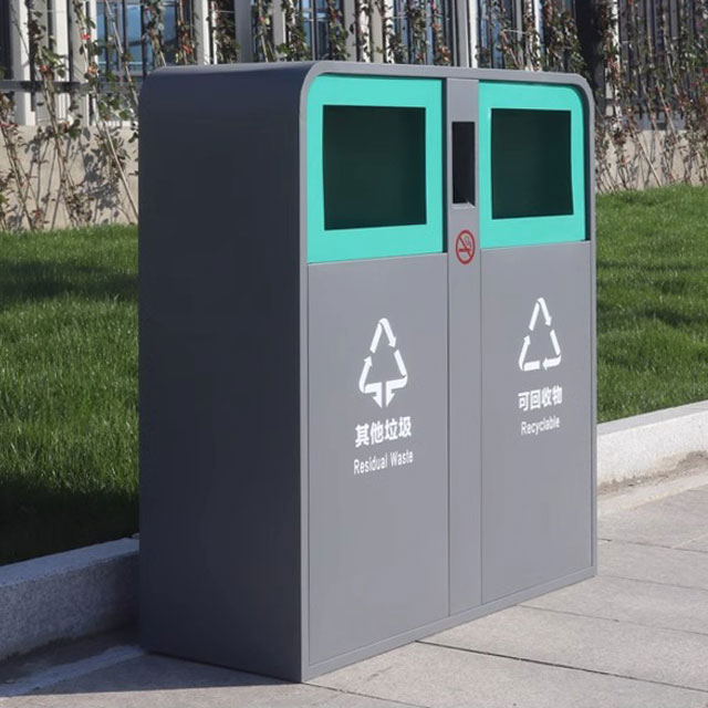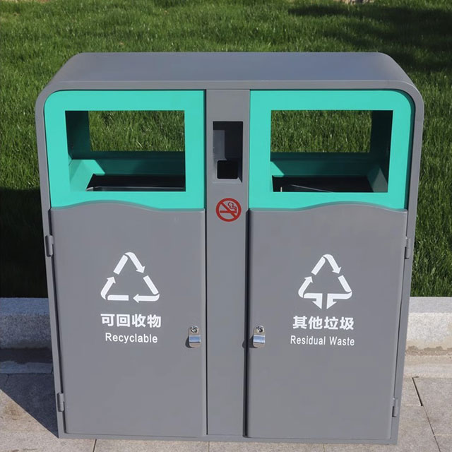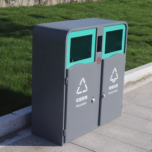 城市街道噴粉不銹鋼分類垃圾桶制作精良,不銹鋼本色戶外連體兩分類方形垃圾桶設計,適合擺放在室內物業(yè)小區(qū)、市政街道、廣場、工業(yè)區(qū)道路或公園景區(qū)等等,注重產品細節(jié)部位處理堅固耐用,安全無利口,不傷手,框架201不銹鋼外筒,不銹鋼內筒也可以選擇鍍鋅板、塑料、玻璃鋼等等,便于垃圾清倒。