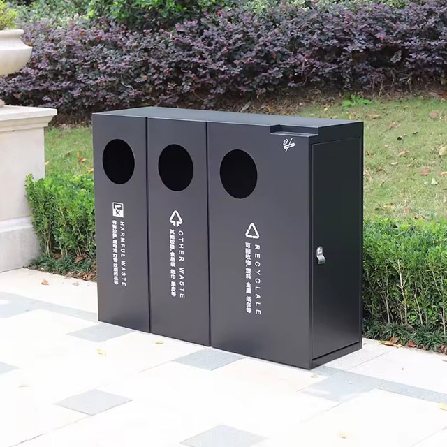 出口公園三分類不銹鋼垃圾桶可以采用201不銹鋼或者304不銹鋼板制造,頂部中心位置凸起出是這款桶創(chuàng)意方形兩連體設(shè)計,正反面油墨絲網(wǎng)印刷最新國標(biāo)分類標(biāo)識和禁煙標(biāo)識,側(cè)面可以定制絲印企業(yè)logo,垃圾桶兩個方形投口中間位置帶滅煙盒,帶三角鑰匙開門方便環(huán)衛(wèi)工人清理內(nèi)置廢物。