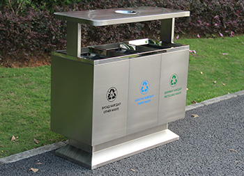 出口戶外三分類不銹鋼垃圾桶這款果皮箱采用了201不銹鋼板制作而成,三分類方形設(shè)計桶身頂部帶煙灰盅,桶身頂部平滑的擋雨棚,正反面絲網(wǎng)印刷了分類標(biāo)識,投口坡面鏡面拋光,桶身外觀整體為不銹鋼啞光本色,我們欣方圳廠家支持定制兩分類、四分類等。