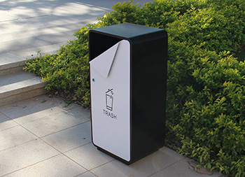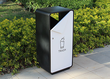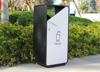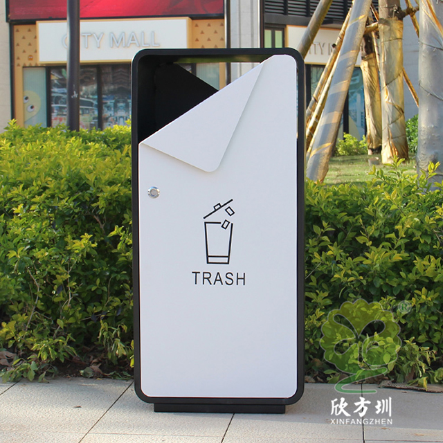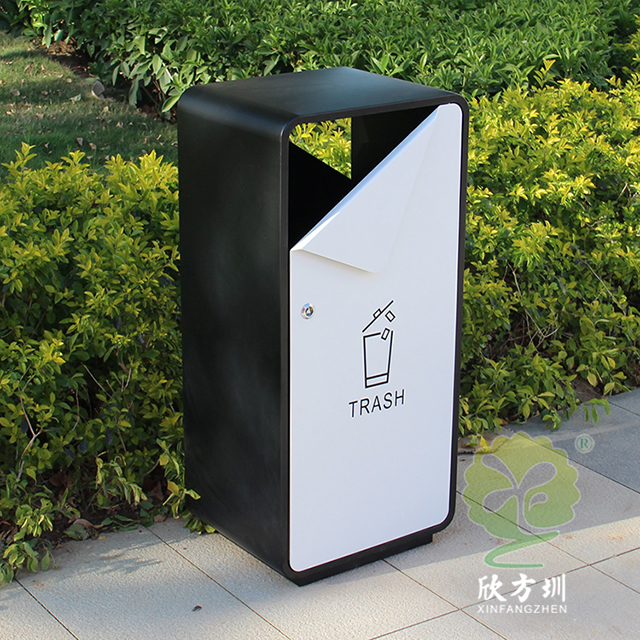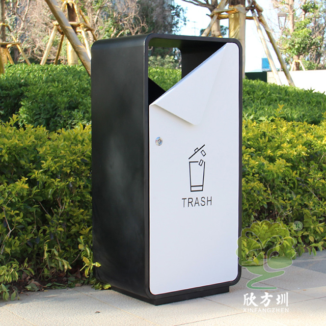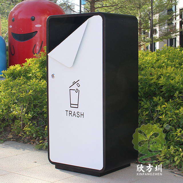 出口貿(mào)易方形噴塑不銹鋼垃圾桶采用了201不銹鋼板制造而成,箱體方形單筒設(shè)計,桶身表面噴塑黑色,桶蓋門板噴塑白色,門板中上方油墨絲網(wǎng)印刷國外的英文回收標(biāo)識,創(chuàng)意的折彎敞面三角形雙面投口設(shè)計,雙面左上方的三角鑰匙可以開門取出內(nèi)膽,欣方圳專業(yè)定制出口貿(mào)易室內(nèi)外分類垃圾桶、單筒。