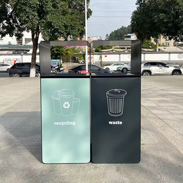 出口貿(mào)易組合式兩分類不銹鋼垃圾桶可以采用201不銹鋼或者304不銹鋼板制造,頂部中心位置凸起出是這款桶創(chuàng)意方形兩連體設(shè)計(jì),正反面油墨絲網(wǎng)印刷最新國標(biāo)分類標(biāo)識和禁煙標(biāo)識,側(cè)面可以定制絲印企業(yè)logo,垃圾桶兩個(gè)方形投口中間位置帶滅煙盒,帶三角鑰匙開門方便環(huán)衛(wèi)工人清理內(nèi)置廢物。