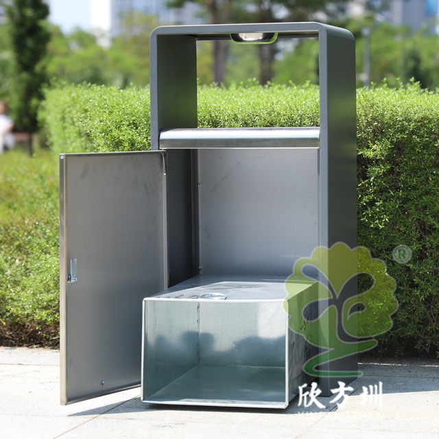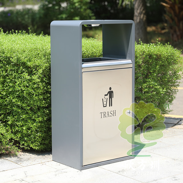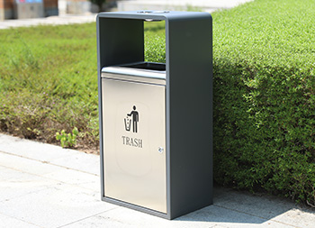 戶外方形單筒不銹鋼果皮箱采用了201不銹鋼板制作而成,也可以使用304不銹鋼板制作,這款果皮箱是一個(gè)國(guó)外的訂單,雙面方形投口設(shè)計(jì),頂部掉一個(gè)碗形的煙灰盅,正反雙面油墨絲印了英文的分類標(biāo)識(shí),垃圾桶外框采用了灰色噴塑工藝,框架看起來比較厚使用了折邊,表面看起來簡(jiǎn)約大氣。