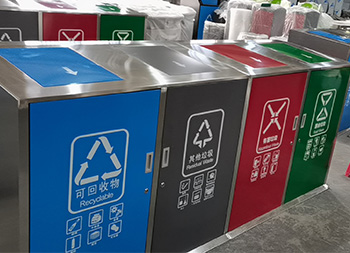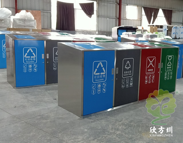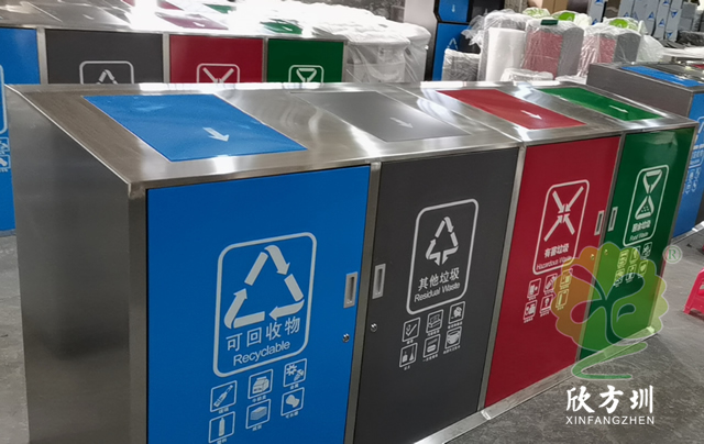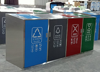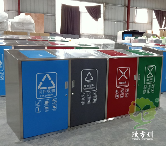 大容量四分類不銹鋼垃圾桶可以采用201、304不銹鋼板制作,戶外方形四分類帶彈蓋設(shè)計(jì),框架不銹鋼本色正面和頂部蓋子采用了不銹鋼高溫烤漆,四色分明分別藍(lán)、灰、紅、綠,絲印了分類標(biāo)識(shí)和指引圖標(biāo),正門三角鑰匙開門旁邊帶把手方便取出內(nèi)筒,可搭配垃圾亭使用。