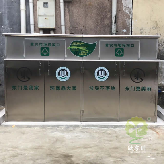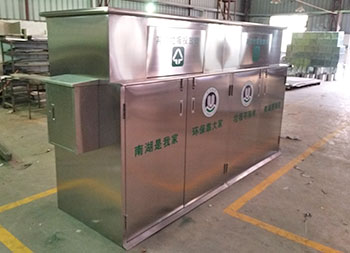 大型戶(hù)外不銹鋼回收箱垃圾房是采用201#不銹鋼本色優(yōu)質(zhì)不銹鋼板機(jī)器折彎組裝焊接打磨等一系列工藝成型,方形垃圾房可以放著4個(gè)240升的塑料垃圾桶在垃圾房里面,搖蓋式開(kāi)蓋設(shè)計(jì)可以良好的防止異味流出,支持定制絲印分類(lèi)標(biāo)識(shí)及企業(yè)logo名稱(chēng)。
