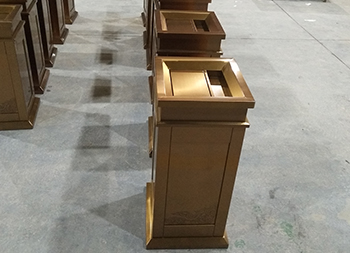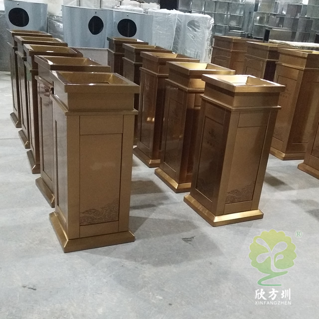 室內(nèi)電鍍方形不銹鋼垃圾桶采用了304不銹鋼裁剪折彎制造而成,室內(nèi)方形立式土豪金搖蓋式設(shè)計,絲網(wǎng)印刷了淡黑色企業(yè)logo,前后左右四塊板刨坑腐刻了裝飾花紋,裝飾花紋也可以采用絲印或者UV打印,這款垃圾桶完美外觀高檔整體奢華。