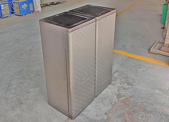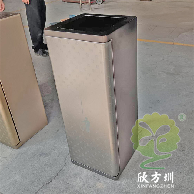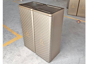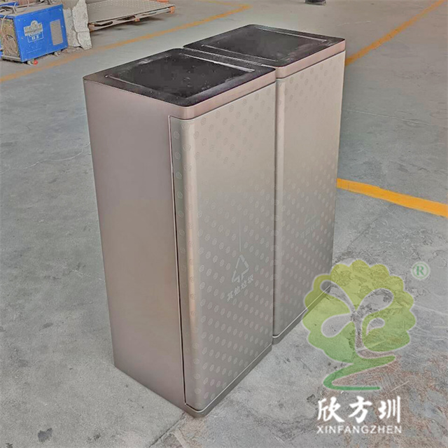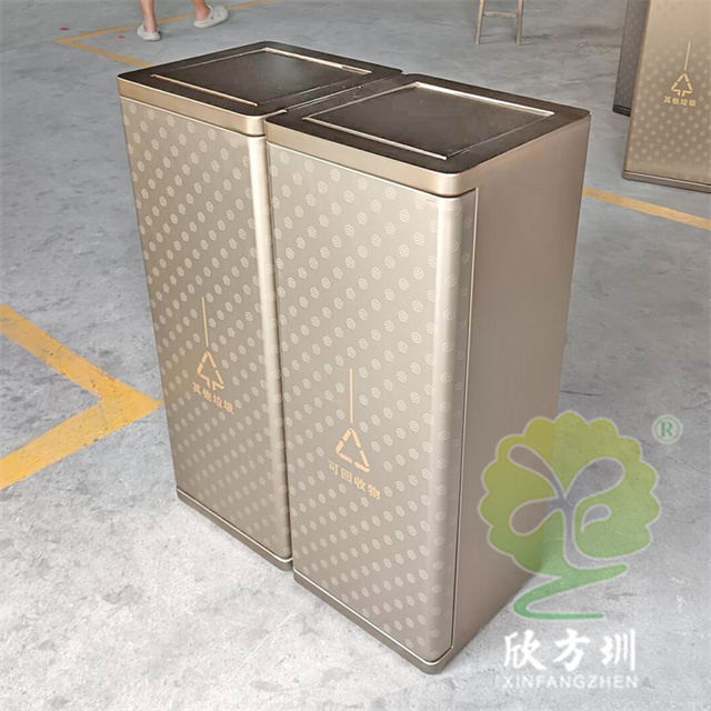 室內(nèi)電鍍腐刻單筒不銹鋼分類垃圾桶可以采用201/304不銹鋼板制造,兩個(gè)款式一款是單筒一款是兩分類方形帶搖擺蓋設(shè)計(jì),雙筒用8*8mm方通相連,門板腐刻印花工藝,不銹鋼金屬表面做了電鍍黑鈦和香檳金工藝,正面抽拉式導(dǎo)軌抽可以取出內(nèi)膽,門板中心位置絲網(wǎng)印刷最新中英文國標(biāo)分類標(biāo)識(shí)或人頭標(biāo)。