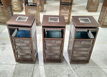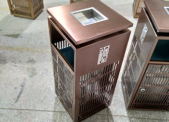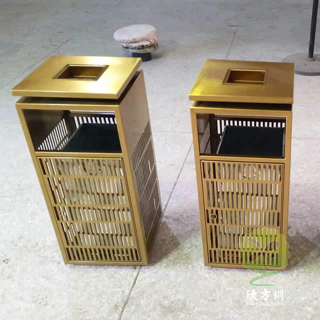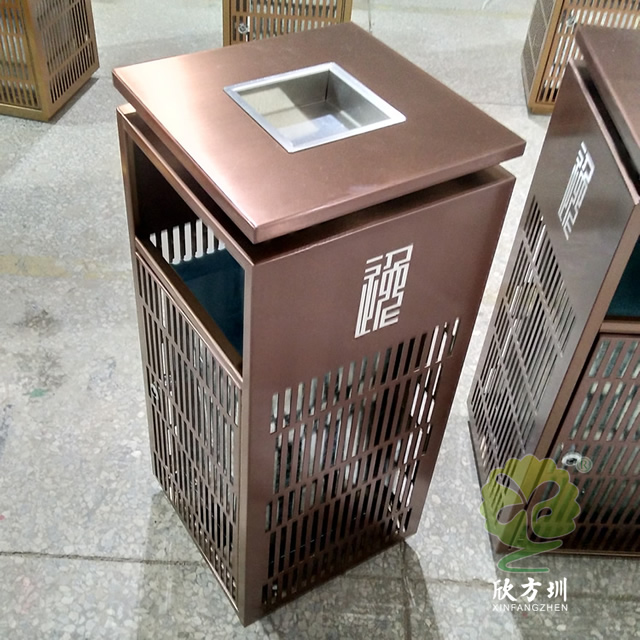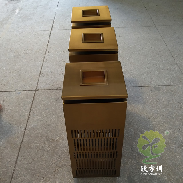 電鍍室內方形不銹鋼果皮箱采用了201不銹鋼板制作而成,激光切割鏤空方形電鍍設計,四面采用了長方形條紋切割鏤空,鏤空并非是減少了成本而是增加了成本,功能是防止積污水,不銹鋼垃圾桶支持電鍍土豪金、香檳金、古銅色等顏色,可以免費絲印企業(yè)logo及名稱等,頂部可以選擇性帶煙灰盅或者不帶,我們是一家專業(yè)做定制的廠家。