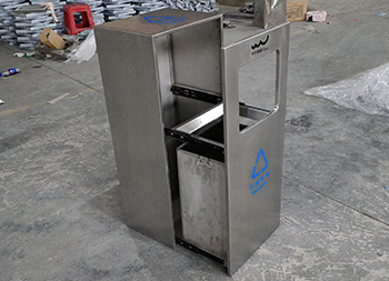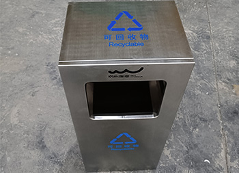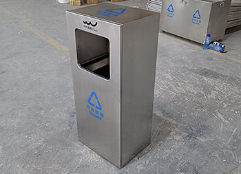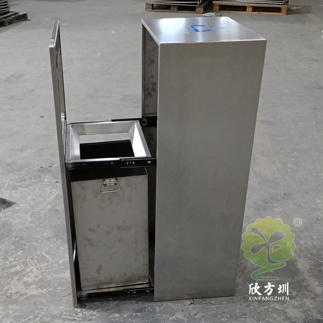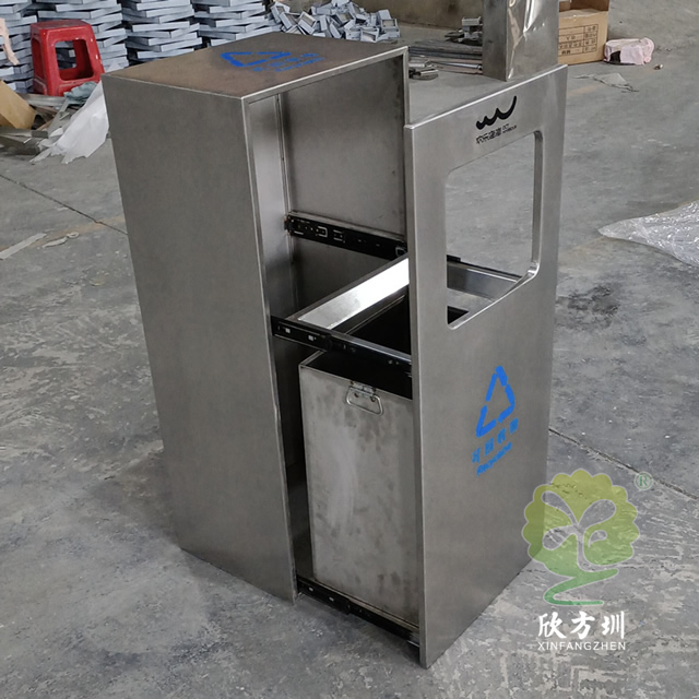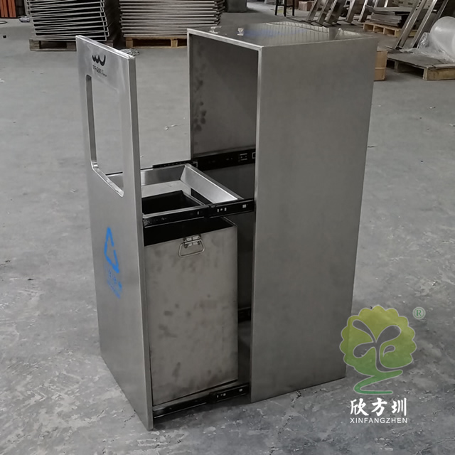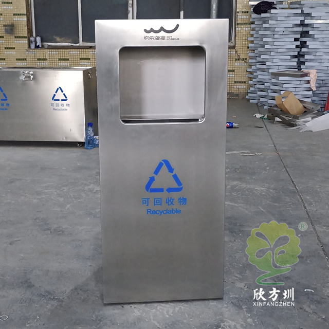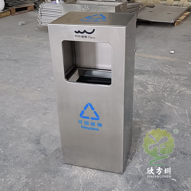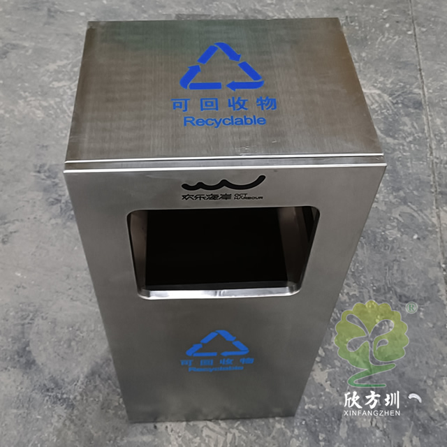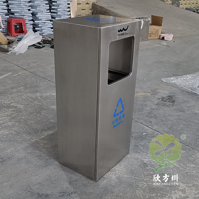 戶外方形滑軌不銹鋼垃圾桶整體桶身內(nèi)筒采用了304#不銹鋼1.0mm厚的不銹鋼板制造而成,高檔簡約方形滑軌式設(shè)計,表面不銹鋼本色啞光,使用了天藍色的油墨絲印了企業(yè)logo以及可回收垃圾,客戶是定制放在垃圾亭回收資源,可以放著戶外做單筒或者電梯口,欣方圳廠家支持室內(nèi)戶外果皮箱定制。
