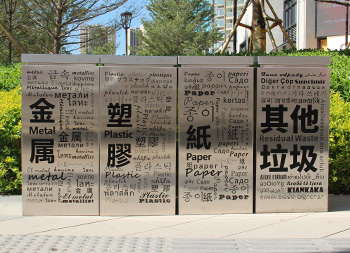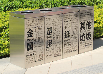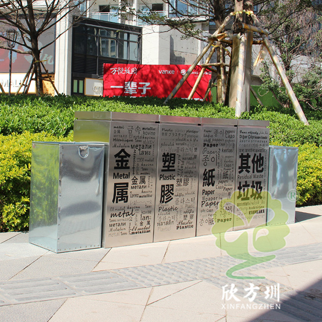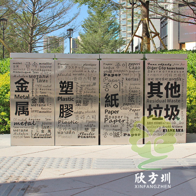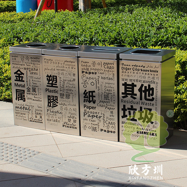 室內創(chuàng)意四分類標識不銹鋼垃圾桶可以選用201或者304不銹鋼板制作,采用立式直投口方形組合式設計,垃圾桶表面不銹鋼本色,正反面采用了黑色油墨絲網印刷了創(chuàng)意分類標識,金屬和塑料桶采用了圓形投口,其他垃圾大型方形投口,廢紙采用了長方形投口,拿出蓋子可以方便的取出里面的鍍鋅板內筒。