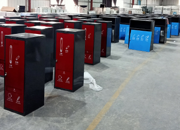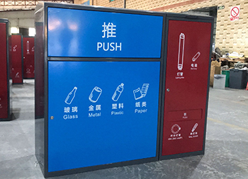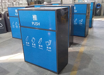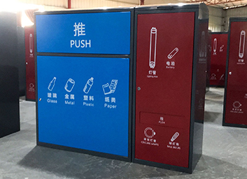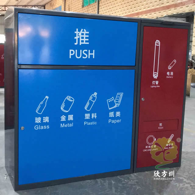 這款組合式不銹鋼分類回收箱采用了201不銹鋼制作而成,方形組合式五分類含蓋資源回收箱設計,垃圾桶框架使用了黑色噴塑,門蓋采用了好色和藍色,絲網印刷了分類回收標示,正面垃圾桶門配備三角鑰匙鎖,分別可以回收玻璃瓶、金屬、塑料、紙類和燈管電池。