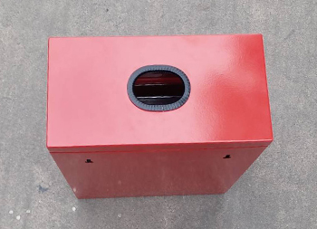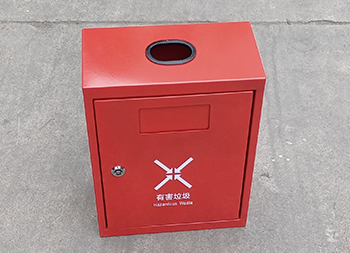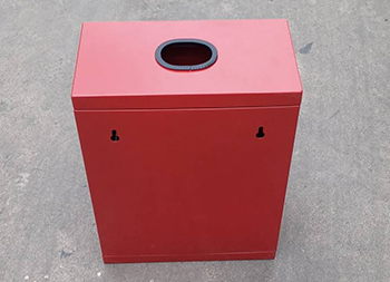 掛壁式不銹鋼有害垃圾回收箱采用0.8mm厚201不銹鋼板制造,也可以采用鍍鋅鐵板制作,方形掛壁式橢圓形直投口設計,金屬表面噴粉烤漆紅色上色,正面采用三角鑰匙可以取出內置的鍍鋅板內筒,投口帶膠墊防止投放時刮傷手掌。