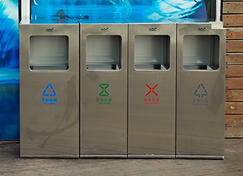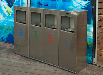 戶外廣場(chǎng)組合式不銹鋼分類(lèi)垃圾桶采用了201不銹鋼板制作而成,四分類(lèi)方形組合式設(shè)計(jì),果皮箱表面啞光,絲網(wǎng)印刷了可回收物、廚余垃圾、有害垃圾、和其他垃圾,投口上方絲印了企業(yè)logo,可回收物的尺寸比其他桶的尺寸需要大一些,其他垃圾桶右上角制作了煙灰柱,方便收集煙頭煙灰。