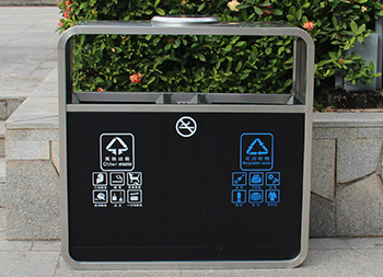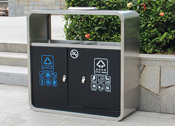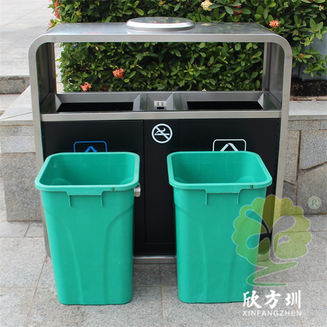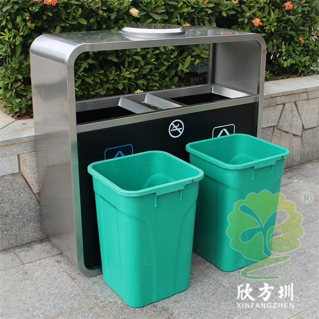 廣州戶外市政街道不銹鋼分類垃圾桶可以采用201不銹鋼或者304不銹鋼板制造,頂部中心位置凸起出是這款桶創(chuàng)意方形兩連體設計,正反面油墨絲網(wǎng)印刷最新國標分類標識和禁煙標識,側面可以定制絲印企業(yè)logo,垃圾桶兩個方形投口中間位置帶滅煙盒,帶三角鑰匙開門方便環(huán)衛(wèi)工人清理內(nèi)置廢物。