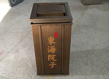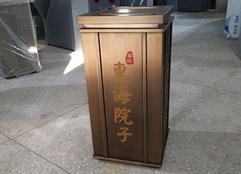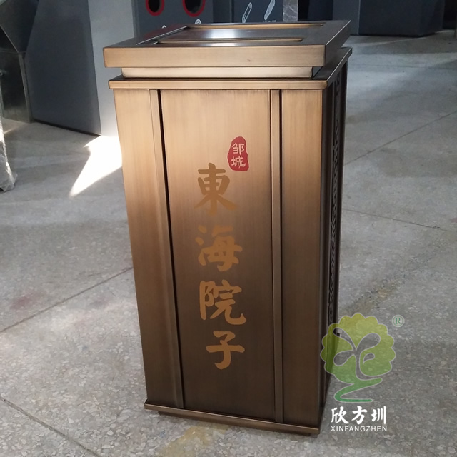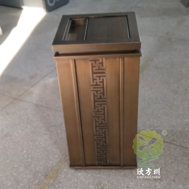 古銅色方形室內(nèi)不銹鋼垃圾桶采用了材質(zhì)201#不銹鋼,前后貼萬字福板,兩側(cè)面絲印,顏色為金色,桶身電鍍古銅色,搖蓋式直投口頂部帶煙灰盅方形設(shè)計,側(cè)面兩邊復(fù)古圖案設(shè)計,我們廠家支持定制可以電鍍其他顏色,可以絲印其他的企業(yè)logo及名稱,此款果皮箱適合擺放高檔場所的電梯口旁邊。