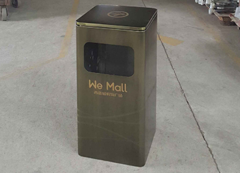 仿青古銅色方形不銹鋼果皮箱采用優(yōu)質(zhì)的304不銹鋼板制作而成,采用了方形單面投口設(shè)計,桶身采用了電鍍仿青古銅色、表面做了防指紋處理、豎條拉絲工藝,頂部桶蓋絲印淡黃色禁煙標(biāo)識,桶身正面絲印了商場企業(yè)logo,垃圾桶桶蓋拿出來可以拿出里面的內(nèi)筒,我們廠家支持垃圾桶定做。