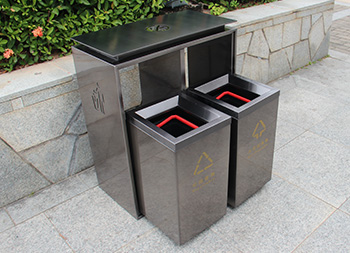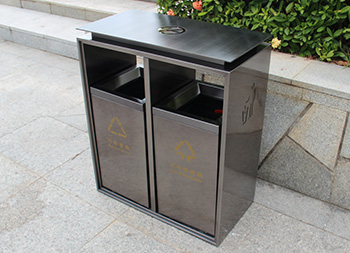 電鍍黑鈦雙分類不銹鋼垃圾桶這款果皮箱采用了加厚201不銹鋼板制作而成,表面深灰色電鍍黑鈦、頂部禁煙標(biāo)識(shí)和左右垃圾投遞標(biāo)識(shí)采用了腐刻工藝,桶身整體做了防指紋處理,方形雙分類滑軌設(shè)計(jì),前后絲網(wǎng)印刷了談黃色可回收物和不可回收物的分類圖標(biāo),適合室內(nèi)外場(chǎng)景使用。
