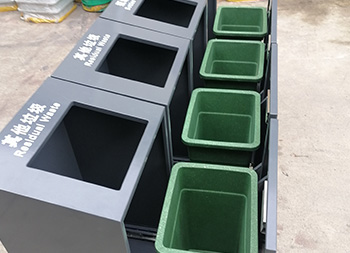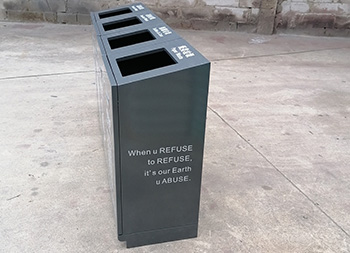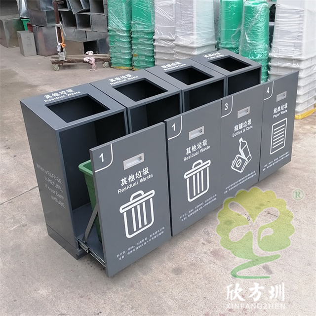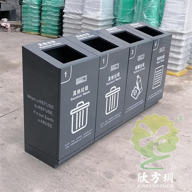 室內(nèi)商用滑軌方形組合式不銹鋼分類垃圾桶外框整體采用了足1.0mm厚的201不銹鋼板制作,坡面方形投口立式直投口單筒方形組合式滑軌設(shè)計,箱體全身深灰色烤漆,底部做了配重,左右兩邊、正面和頂部投口使用了白色油墨絲印中英文分類標識及文字,可以定制其他垃圾、可回收物桶等。