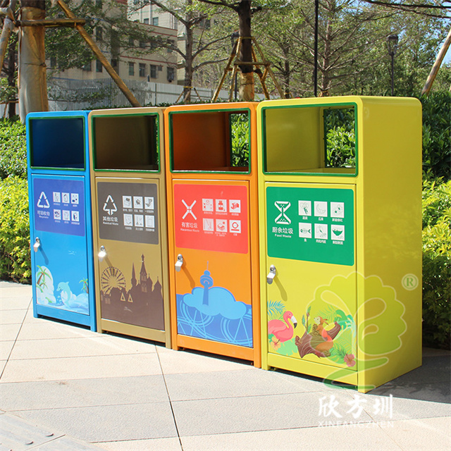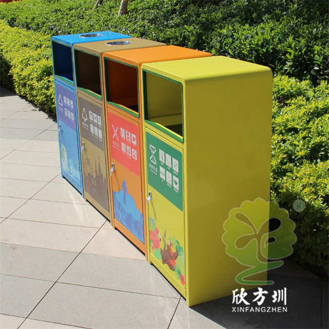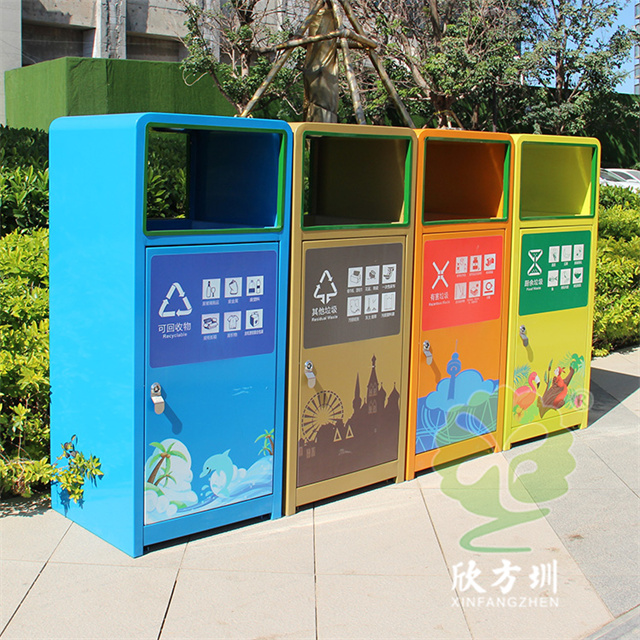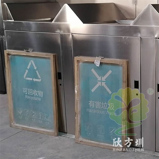 戶外不銹鋼三分類密閉式垃圾屋桶身采用優(yōu)質 201#不銹鋼 1.0mm 厚度生產(chǎn)的,戶外連體三分類屋形設計,絲印單色的分類標識,可回收物藍色油墨,有害垃圾紅色油墨,其他垃圾黑色油墨,頂部和投口都采用了油墨絲印了黑色名稱標識,箱體不帶里面的塑料內筒,內筒是使用常規(guī)240L塑料垃圾桶。
