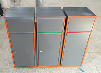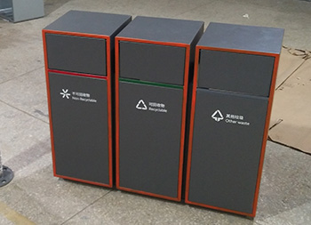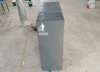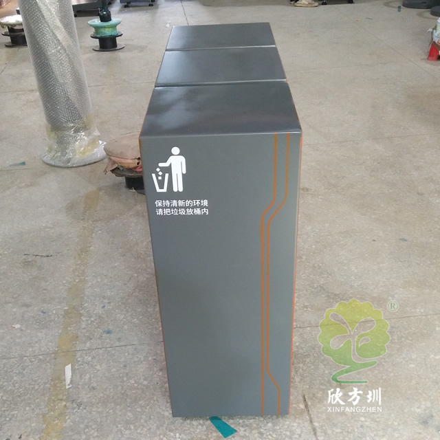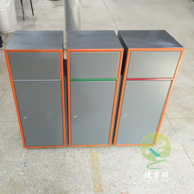 戶外組合式不銹鋼分類果皮箱這款垃圾桶采用了1.0mm厚的201不銹鋼板制作而成,不可回收物、可回收物、其他垃圾三分類組合式方形設(shè)計,桶身整體噴塑深灰色,正反面投口下方小橫條噴塑灰色綠色紅色三種不同的顏色,正面絲印了分類標(biāo)識,左右頂部絲印了人頭標(biāo)和標(biāo)識,,反面三角鑰匙開門這款桶工藝復(fù)雜。