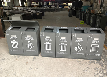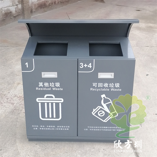 戶外滑軌兩連體不銹鋼分類垃圾桶可以采用201/304不銹鋼板、鍍鋅板、熱軋鋼板制作,方形兩連體滑軌設(shè)計(jì),投口上方帶弧形擋雨棚,桶身表面灰色噴涂噴塑,絲印了白色的其他垃圾和可回收垃圾分類標(biāo)識(shí),正面帶抽拉式把手,欣方圳廠家支持定制。