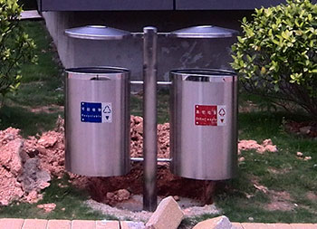 戶外圓柱形不銹鋼分類垃圾桶桶身采用了優(yōu)質(zhì)的201#不銹鋼板制造,兩個(gè)圓柱形桶身可回收物、其他垃圾兩分類設(shè)計(jì),底部帶四個(gè)膨脹螺絲孔可以固定在地面,這款垃圾桶的底座部分長可以埋在地面里,桶身整體顏色為不銹鋼砂鋼,分類標(biāo)識(shí)是貼的鋁牌子用膨脹螺絲固定的,投口邊緣是不銹鋼鏡面顏色,取出內(nèi)筒只需要把垃圾桶的擋雨棚往上開就可以輕易的取出內(nèi)筒來。