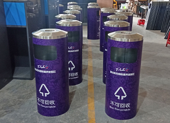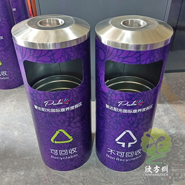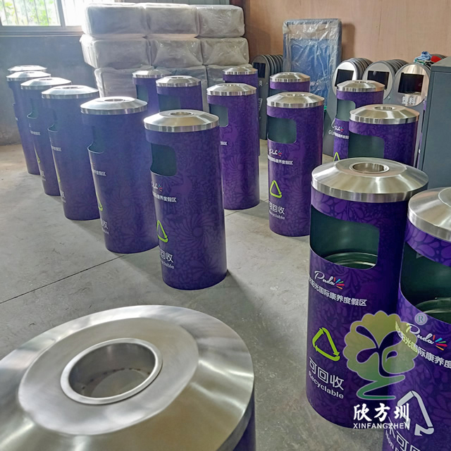 戶外圓柱形分類不銹鋼垃圾桶采用了201#不銹鋼板制造而成,圓柱形組合式雙分類設(shè)計(jì),表面采用了貼紫色貼紙,貼這款貼紙工序繁瑣比較復(fù)雜一般小心就貼歪,單面方形投口,頂部中心位置帶一個(gè)圓形的煙灰盅,這款垃圾桶康養(yǎng)度假中心景區(qū)的擺放在戶外高檔大氣上檔次。