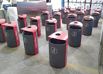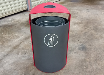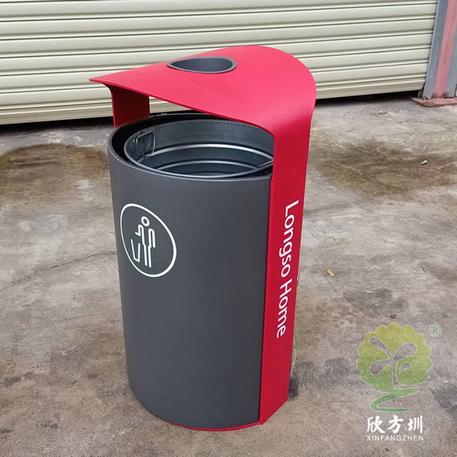精品戶外環(huán)保不銹鋼垃圾桶采用了201的不銹鋼板制作而成,采用了橢圓形單筒設(shè)計(jì),框架采用了噴涂噴塑紅色外桶噴塑了淡黑色,外桶中上位置絲印了人頭標(biāo),兩根立柱支撐桿絲印了英文的物業(yè)名稱,頂部中心位置帶一個(gè)淡黑色的圓形煙灰盅,外桶中間旁邊帶一個(gè)三角鑰匙開可以取出里面的內(nèi)筒。