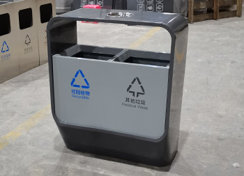 戶外噴塑不銹鋼分類垃圾桶采用了201#型號(hào)1.0厚的不銹鋼板制作而成,方形兩分類設(shè)計(jì),兩種顏色噴塑灰色、灰白搭配,底部創(chuàng)意設(shè)計(jì)小斜口坡面,頂部中心位置帶一個(gè)圓形煙灰盅,正面絲印了可回收物和其他垃圾,正面三角鑰匙開(kāi)門可取出設(shè)備里面的內(nèi)筒。