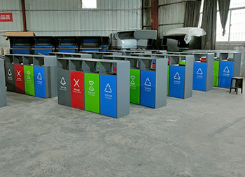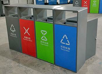 戶外噴塑四色不銹鋼分類(lèi)果皮箱垃圾桶采用了201#不銹鋼1.0mm厚的板生產(chǎn)而成,桶身表面噴塑烤漆了灰色,正面門(mén)板噴塑烤漆了四種顏色,分別有其他垃圾灰色、有害垃圾紅色、廚余垃圾綠色、可回收物藍(lán)色,背面可使用三角鑰匙取出內(nèi)筒,方形連體無(wú)煙灰盅設(shè)計(jì),這款產(chǎn)品支持定制兩分類(lèi)三分類(lèi)以及單筒。