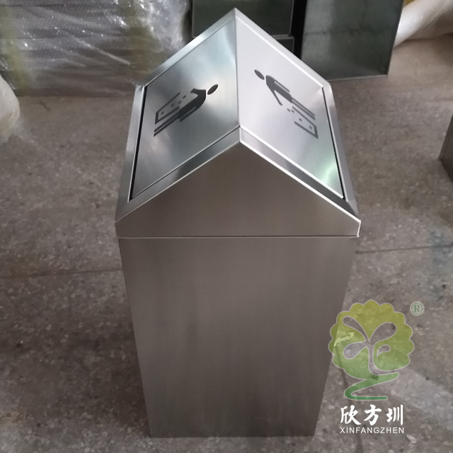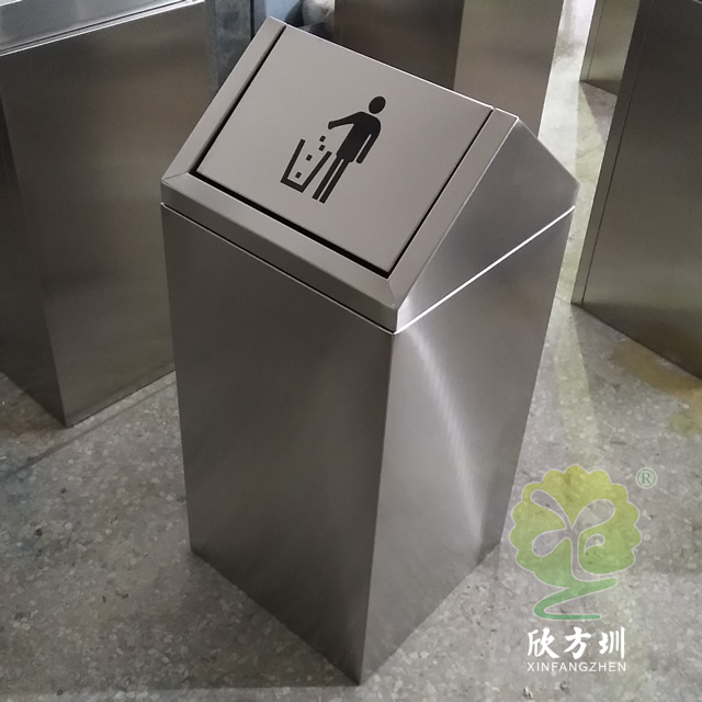 商場單筒搖蓋式不銹鋼垃圾桶采用304#不銹鋼板制作而成,屋形搖蓋式方形設(shè)計(jì),這款果皮箱表面采用了啞光處理,表面處理有電鍍、烤漆、防指紋處理、拉絲、UV打印等可以根據(jù)客戶要求提供定制,頂部絲印了投遞垃圾的圖標(biāo),或者客戶自己提供企業(yè)logo我們可以印刷上去。
