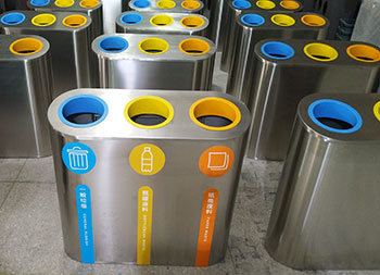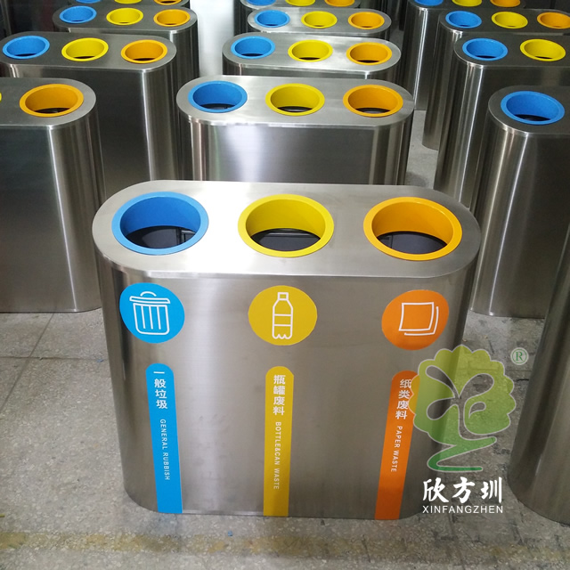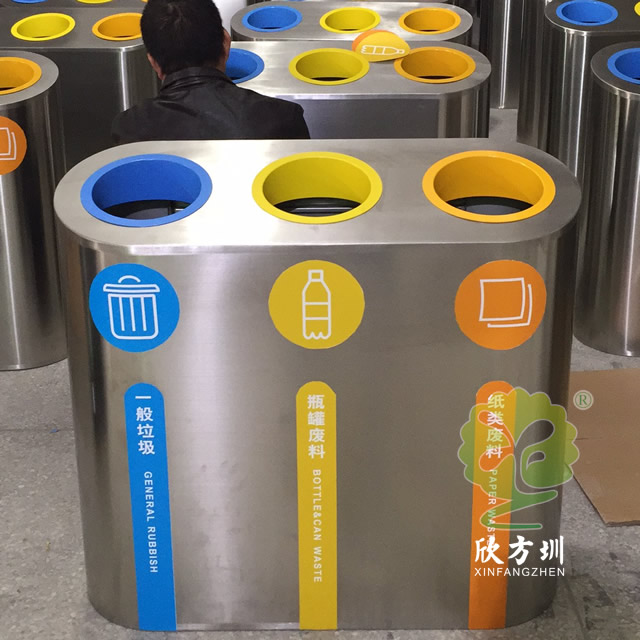 商場立式三分類不銹鋼垃圾桶采用201不銹鋼制造而成,立式直投口包涵一般垃圾、瓶罐廢料、紙類廢料三分類,垃圾桶分類標(biāo)識是三色貼紙,投口邊圓形設(shè)計不易傷手,適合擺放在室內(nèi)的商場、機場、候車室等場景。