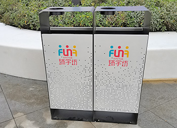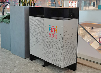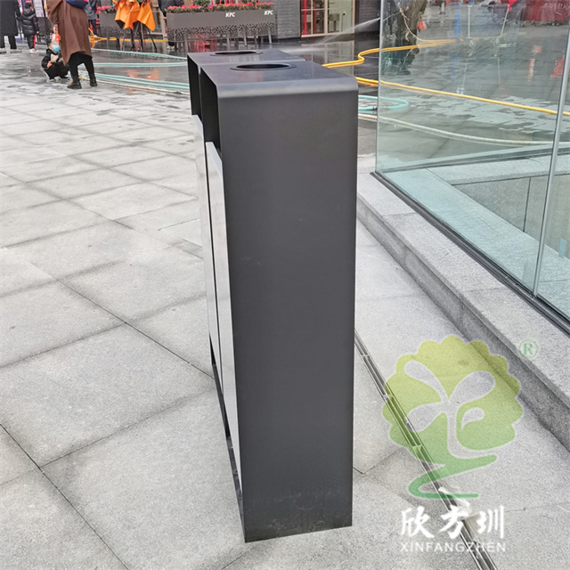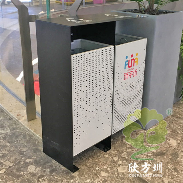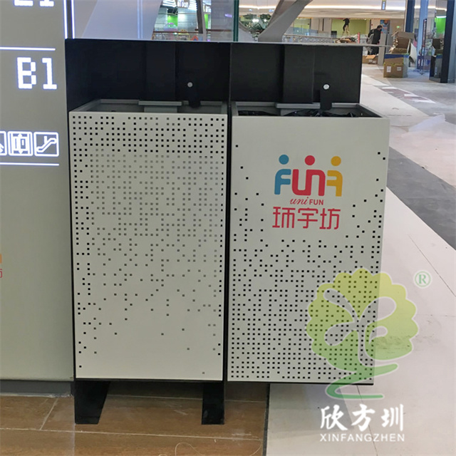 商場廣場鏤空加厚不銹鋼分類垃圾桶可以選擇用鍍鋅板、冷軋鋼板或者不銹鋼板制造,這款垃圾桶框架比較厚實能夠防止割到手,表面噴涂噴塑俗稱噴粉,外部框架噴塑黑色箱體噴塑淺灰色,箱體圓點鏤空,這款垃圾桶是一家商場定制了兩款,一款用于商場室內(nèi)一款用于戶外的廣場,桶身正反面絲印的企業(yè)的分類標(biāo)識。