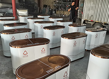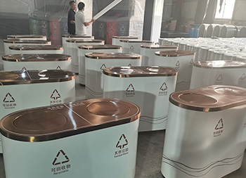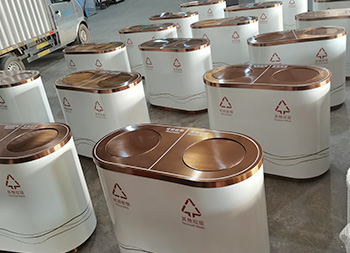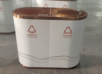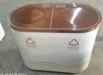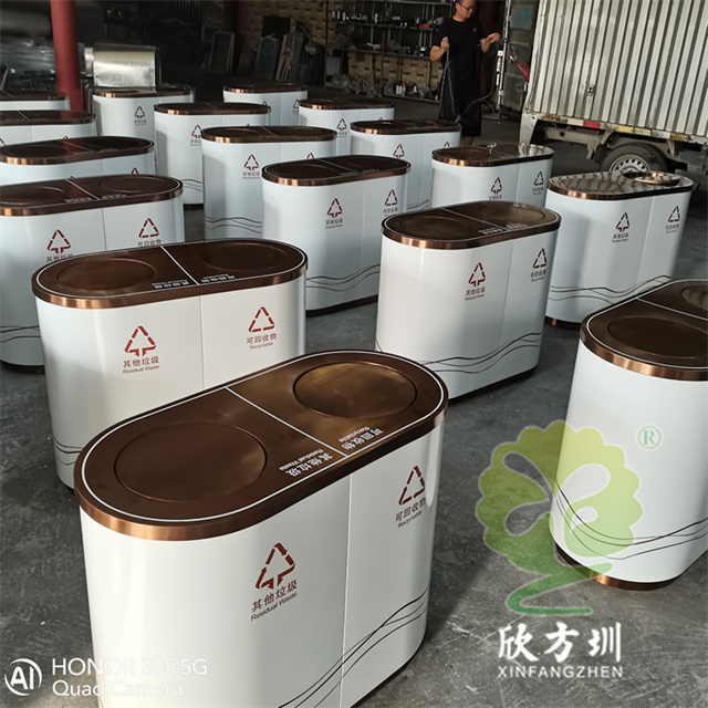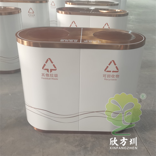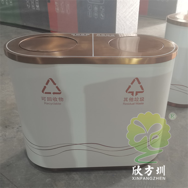 商用帶蓋不銹鋼分類垃圾桶材質(zhì)可以選擇201、304不銹鋼板或者其他金屬板制作,連體兩分類橢圓形帶搖擺蓋設(shè)計,蓋子和桶身電鍍了香檳金和米白色,桶身正反面和上方蓋子絲印了分類標(biāo)識,方便區(qū)分垃圾桶的垃圾分類,這款垃圾桶可以本色或者三分類四分類的,我們廠家支持定制歡迎聯(lián)系。