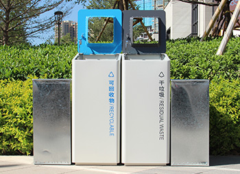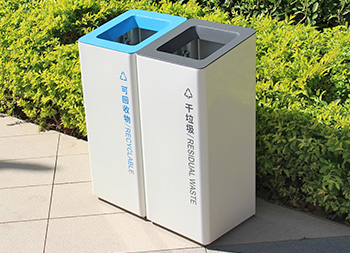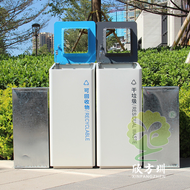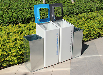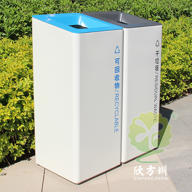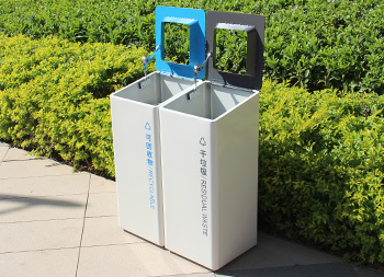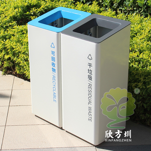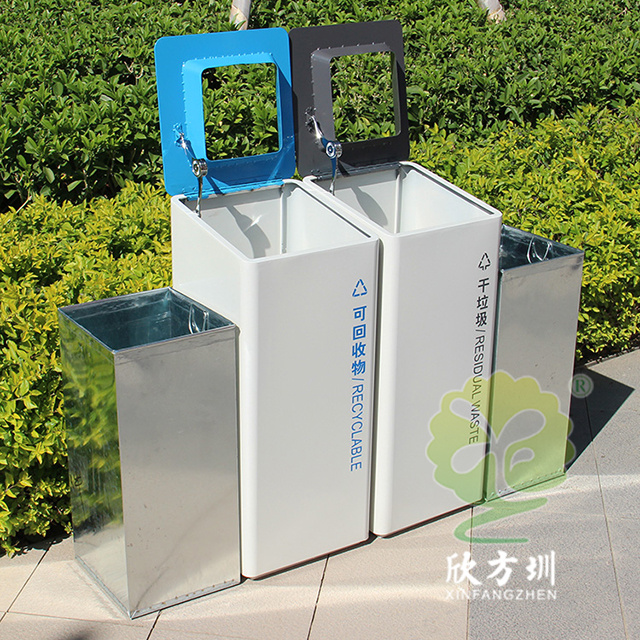 室內(nèi)噴塑不銹鋼分類垃圾桶采用了201#不銹鋼板制造而成,立式直投口方形兩分類組合式設計,桶身整體噴塑了米白色,可回收物標識采用藍色絲印的桶蓋也是藍色,干垃圾標識和蓋子采用了灰色油墨絲印,能夠有效的區(qū)分標識進行有效的分類,方形大號投口桶蓋液壓撐桿開蓋方式方便取出內(nèi)筒進行清理。