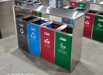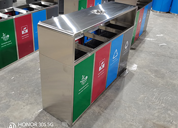 城市街道四色不銹鋼分類垃圾桶可以選用201/304不銹鋼板制作,戶外方形四分類設計,正面門板采用了磁吸式下拉開門可以取出內(nèi)筒,四個門板使用了四種噴塑顏料上色,噴塑了灰色、藍色、紅色、綠色絲印對應的國家最新分類標識,開料前期頂部可以選擇性需不需要煙灰盅,可以定制兩分類、三分類、五分類的這款垃圾箱。