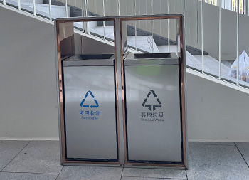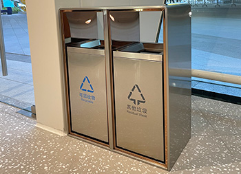 戶外電鍍香檳金不銹鋼分類垃圾桶采用了201#不銹鋼板制作而成,兩連體方形分類抽拉式滑軌設(shè)計(jì),垃圾箱桶身整體為金色本色,內(nèi)框架采用了電鍍香檳金邊框,雙面投口外桶資訊位置絲印單色的最新國標(biāo)分類標(biāo)識,可回收物油墨絲網(wǎng)印刷了藍(lán)色、其他垃圾油墨絲網(wǎng)印刷了灰色,這款垃圾桶高檔輕奢美觀大氣。