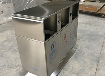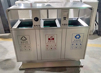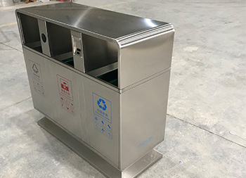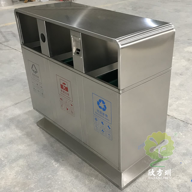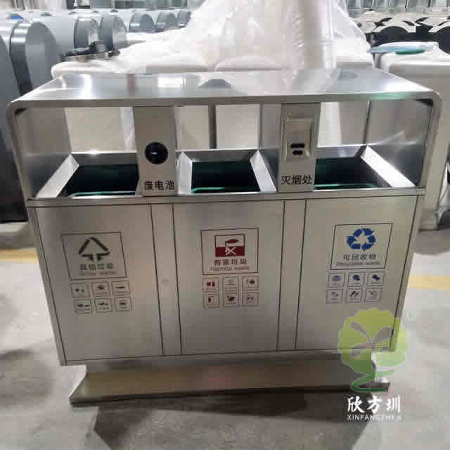戶外校園環(huán)衛(wèi)三分類不銹鋼垃圾桶采用優(yōu)質(zhì)的201不銹鋼板裁剪折彎拼接焊接打磨而成,此款垃圾桶采用雙面投口三分類可回收物、有害垃圾、其他垃圾設(shè)計(jì),投口上端帶一個(gè)廢電池和滅煙處小型投口方便收集煙頭和廢電池,垃圾箱頂部平滑設(shè)計(jì),可以絲印垃圾分類標(biāo)識(shí)logo及企業(yè)名稱。