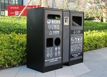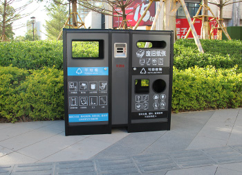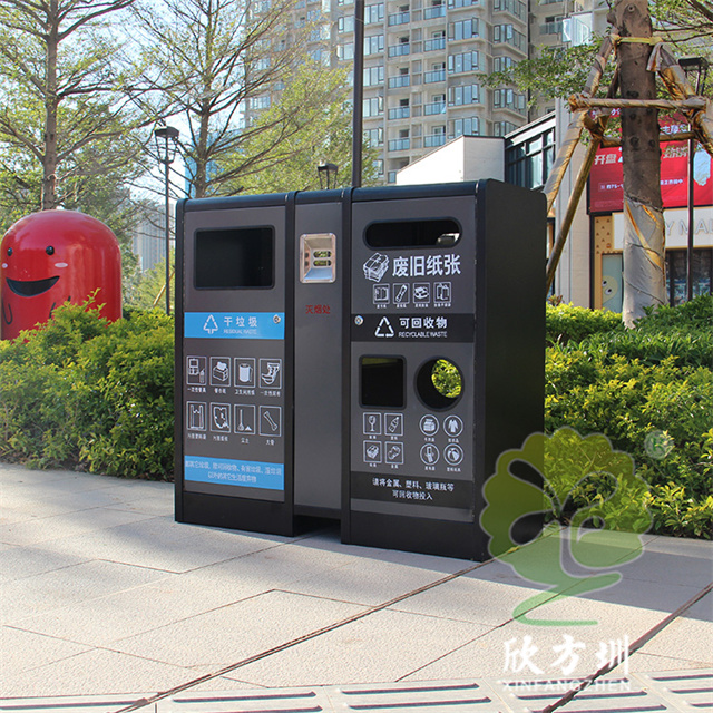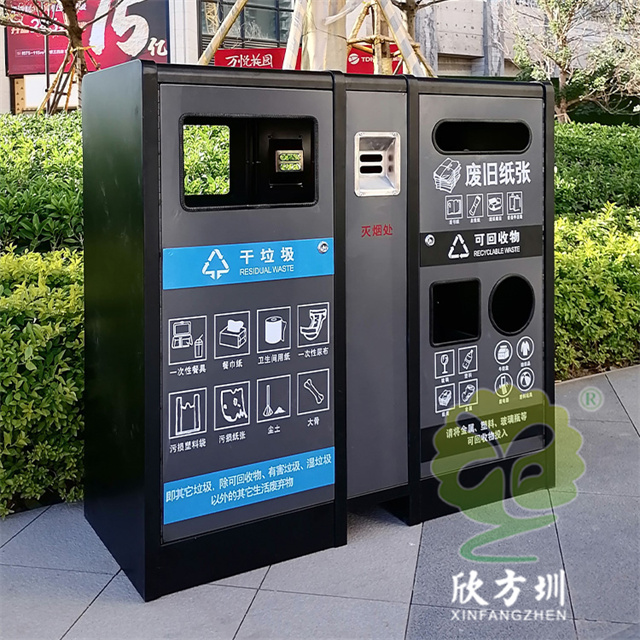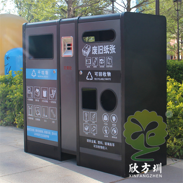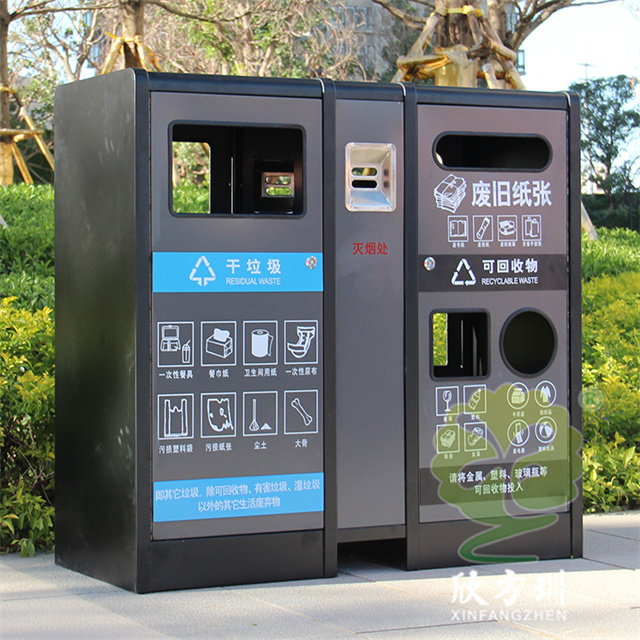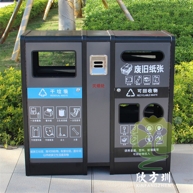 室內(nèi)寫字樓不銹鋼分類垃圾箱采用201不銹鋼1.0mm厚的板制作而成,雙面投口方形兩連體方形四分類設(shè)計(jì),箱體采用了黑色跟灰色配色,桶門板用油墨絲網(wǎng)印刷了兩個(gè)大類分類標(biāo)識(shí),分別干垃圾和可回收物,可回收物有三個(gè)投口分別采用方形、長(zhǎng)方形和圓形開(kāi)口可以區(qū)分不同可回收物,正反面中心位置帶一個(gè)滅煙盒方便煙民抽煙使用,有效避免垃圾桶著火。