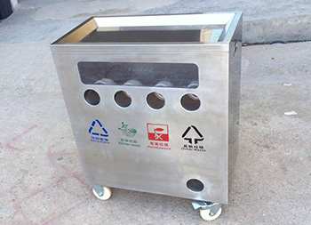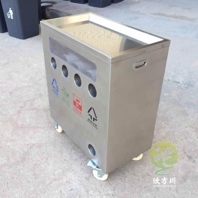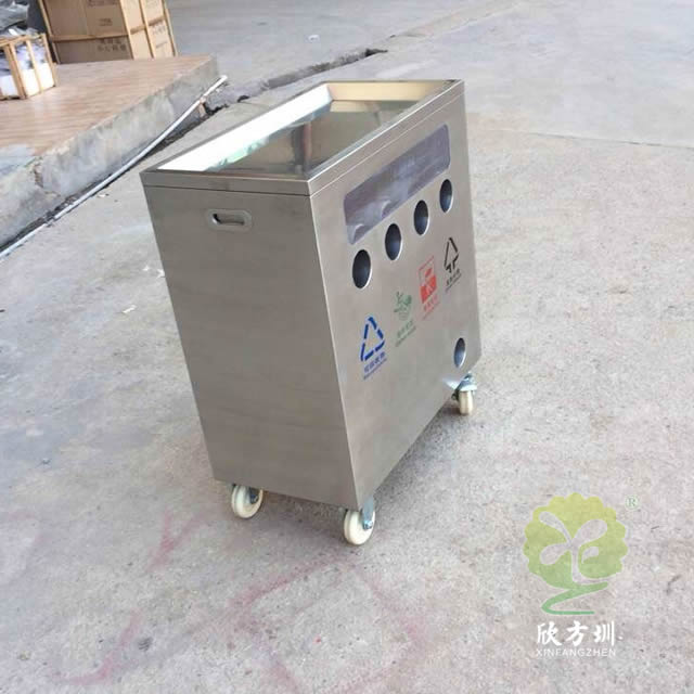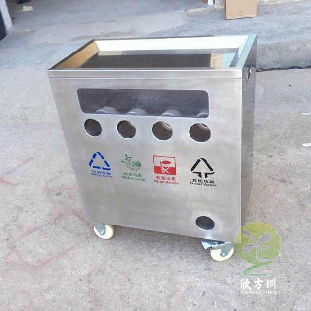 幼兒園訓(xùn)練分類不銹鋼垃圾桶這款垃圾箱材料201新料不銹鋼板制作而成,方形四分類底部帶輪子投口圓形設(shè)計(jì),正面絲印了可回收物、廚余垃圾、有害垃圾其他垃圾的分類標(biāo)識(shí),左右頂部帶把手發(fā)布抬動(dòng),底部四個(gè)滑輪方便推動(dòng),桶內(nèi)四個(gè)塑料管道無內(nèi)筒,是一款學(xué)校訓(xùn)練培訓(xùn)養(yǎng)成垃圾分類的垃圾箱。