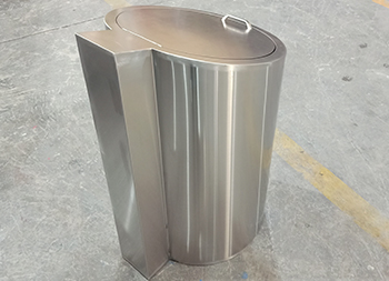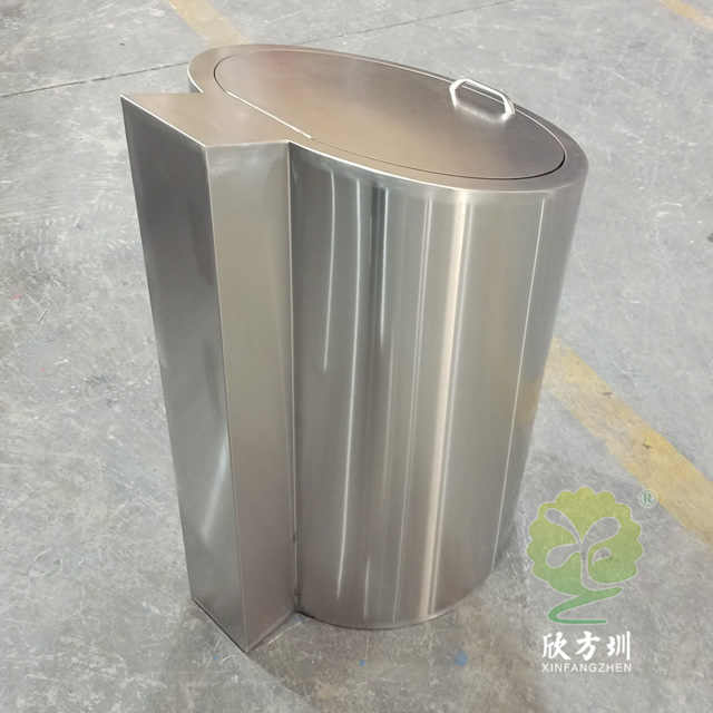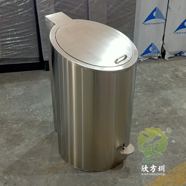室內(nèi)圓柱形腳踏式不銹鋼垃圾桶使用了201不銹鋼板裁剪打磨拋光生產(chǎn)而成,采用了圓柱形腳踏式設(shè)計(jì)制作,不銹鋼外桶表面白色亮光處理,頂部投口斜口設(shè)計(jì),桶蓋帶帶把手設(shè)計(jì),可以手提把手開蓋或者使用腳踏式開門投遞廢物到桶內(nèi),后面長方形柱子包裹了腳踏式的拉桿,內(nèi)筒是圓柱形的呆提手。