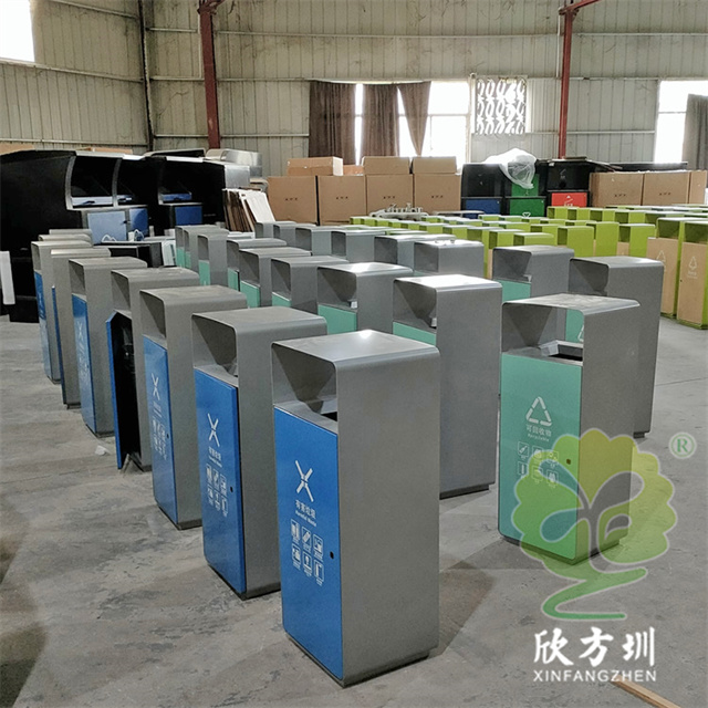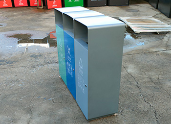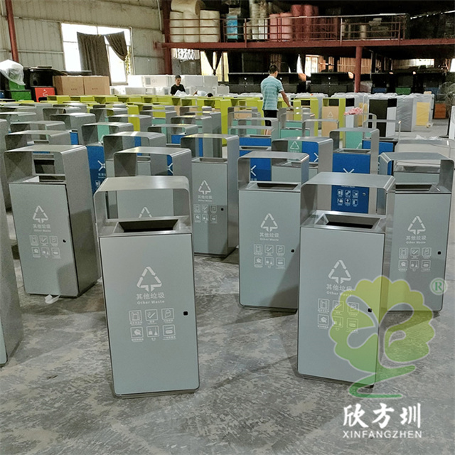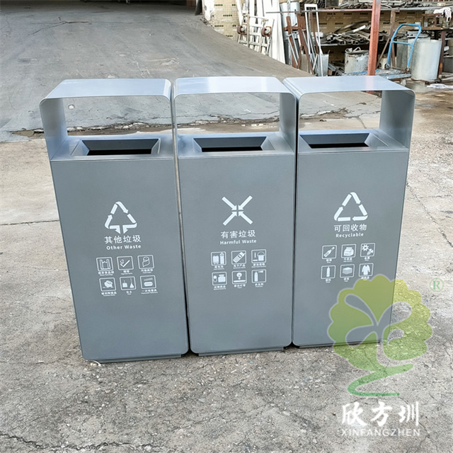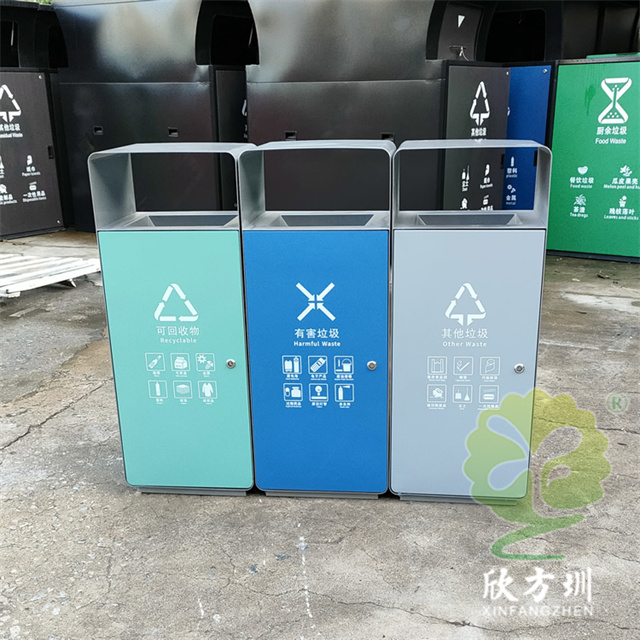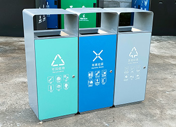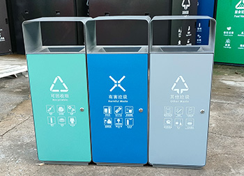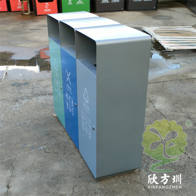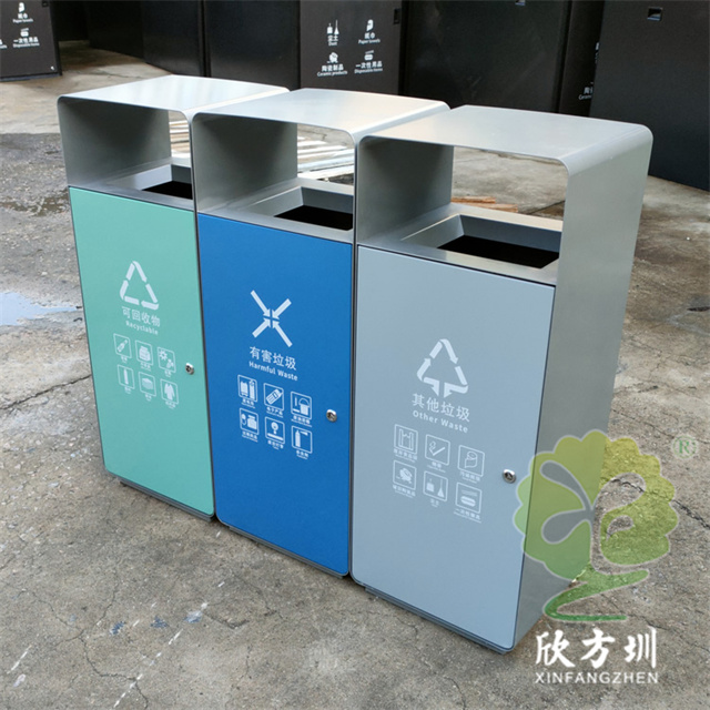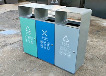 戶外自由組合三色不銹鋼分類垃圾桶使用了201#不銹鋼板制作,外部框架采用了2.5mm厚,桶身采用了1.0mm厚的不銹鋼板裁剪折彎制造,單筒雙面?zhèn)让嫱犊诜叫卧O(shè)計(jì),可以任意自由組合分類,外部框架噴塑灰色,門(mén)板正反面噴塑了不同的顏色,可回收物噴塑淡藍(lán)色、有害垃圾噴塑天藍(lán)色、其他垃圾噴塑了淡灰色,可以組合制作兩分類、四分類、五分類。