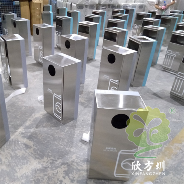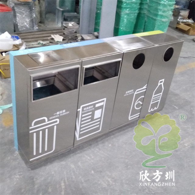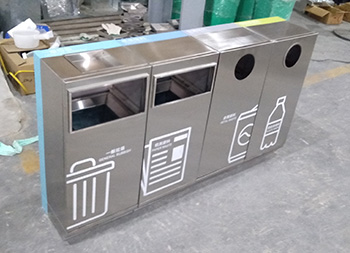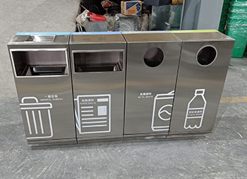 戶外組合式滑軌抽拉式不銹鋼分類垃圾桶可以采用201/304不銹鋼,表面可以采用電鍍或噴塑處理,投口采用方形或圓形開口設(shè)計,上方可以選擇性方形煙灰盅設(shè)計,正面抽拉式滑軌開門可以取出內(nèi)膽,表面絲網(wǎng)印刷大號分類標(biāo)識。