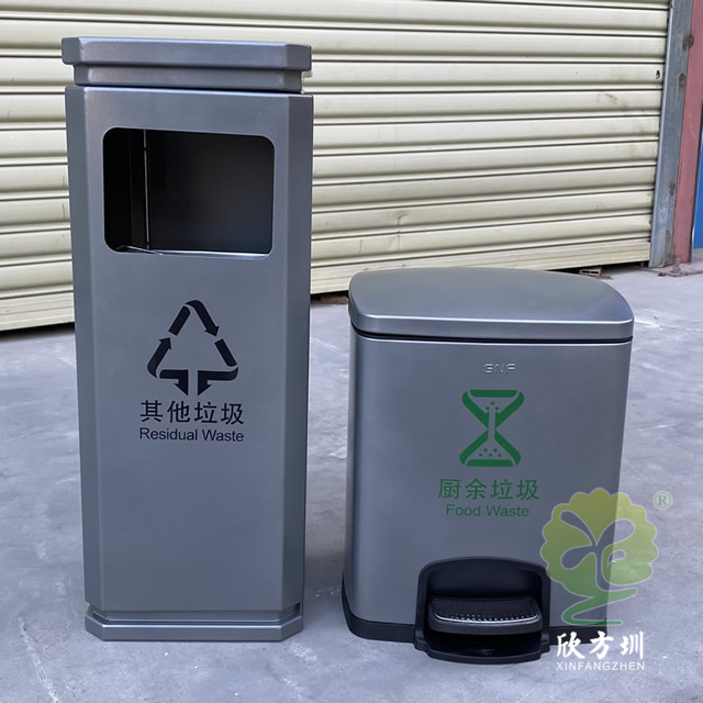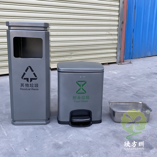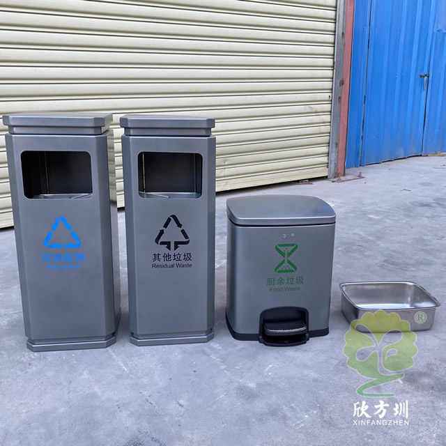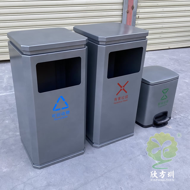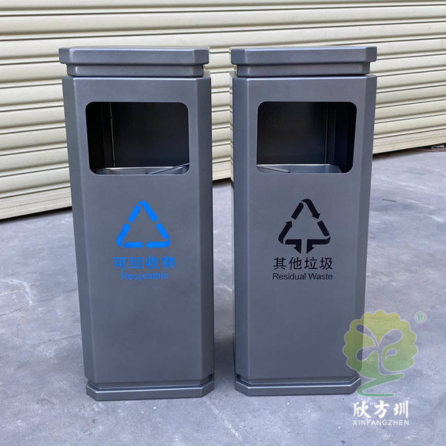也是戶外組合方形不銹鋼分類垃圾桶圖片型號(hào)為:C821-1;尺寸規(guī)格:250*250*650;產(chǎn)品材質(zhì):201不銹鋼;表面處理工藝:灰色噴塑;這款垃圾桶可以擺放在室內(nèi)的電梯口旁邊,客戶定制這款果皮箱是擺放戶外的垃圾亭內(nèi)的,方便分類投放。