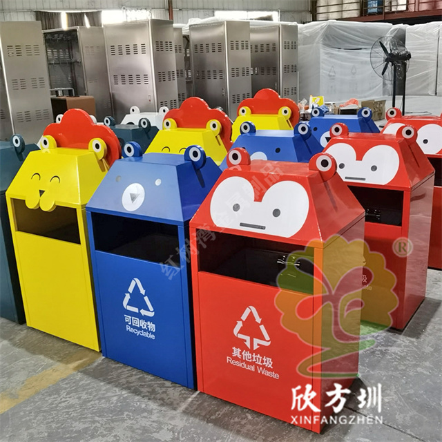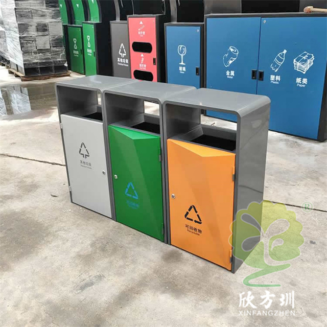 戶外學(xué)校廣場分類垃圾桶圖片,這些垃圾桶圖片款式我們欣方圳為學(xué)校制造的,擺放在學(xué)校操場公園等等場景,噴塑的款式都可以用鍍鋅鐵板、冷軋鋼板、不銹鋼板制造,分類可以做組合式、單筒、兩分類、三分類、四分類、五分類桶,顏色可以定制,可以定做密閉式帶蓋的桶,一般學(xué)校是不做煙灰盅的垃圾桶。