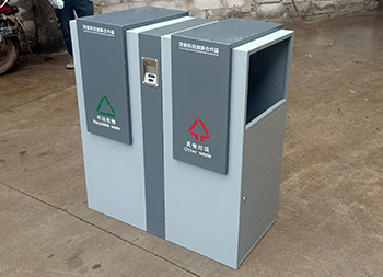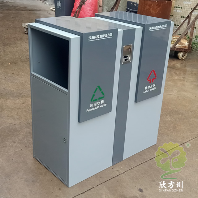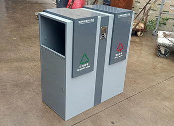 戶外方形分類鋼制垃圾桶采用了加厚的冷軋鋼板制作而成,采用了方形雙分類設(shè)計(jì),側(cè)面兩邊垃圾桶頂部方形投口,側(cè)面下邊位置是垃圾桶門可以使用三角鑰匙開門取出內(nèi)筒,表面顏色噴塑了米白和灰白,前后中上位置帶一個(gè)煙灰盅,正反面中心位置絲印了分類圖標(biāo)頂部絲印了企業(yè)名稱。