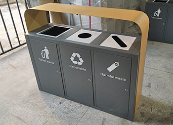 高檔仿木紋三分類垃圾桶整體都采用深灰色部分201#不銹鋼0.8mm,仿木紋色部分201#不銹鋼2.5mm厚0.4mm鍍鋅板內(nèi)筒。產(chǎn)品一律用室外粉靜電噴塑或者烤漆,經(jīng)過(guò)180°的高溫,限度延長(zhǎng)了戶外垃圾桶的使用壽命,使鋼制垃圾桶顏色持久不變,亮麗如新。