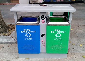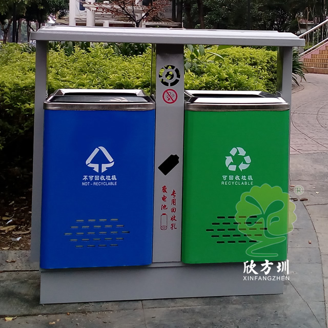 公園景區(qū)戶外鋼制分類垃圾桶采用了優(yōu)質的冷軋鋼板制作而成,兩分類高檔精品設計,框架淡灰色、不可回收垃圾桶藍色、可回收垃圾桶綠色表面上色采用了噴涂噴塑,絲網印刷采用了白色,中間中下兩邊含有一個廢電池投口,中上帶一個煙灰盅投口,支持定制可以選擇性開煙灰投口或者不開。