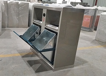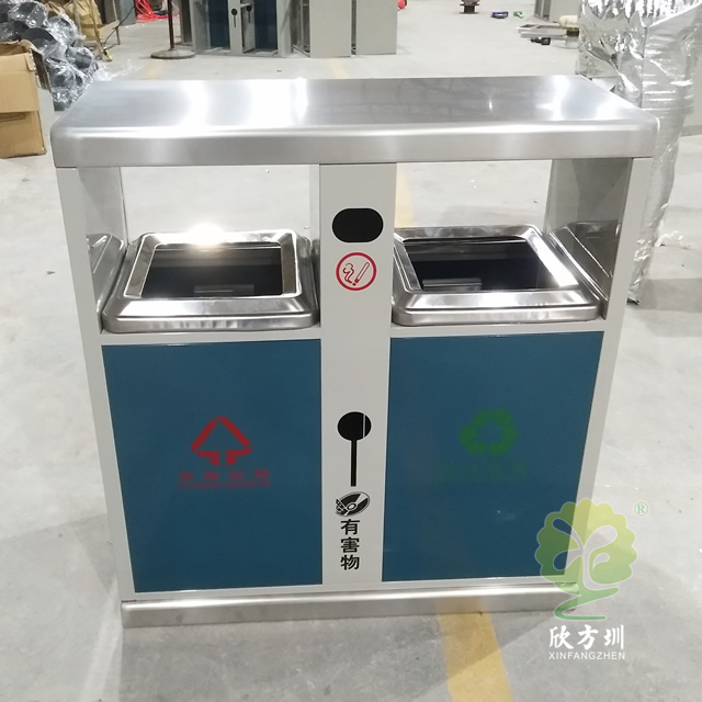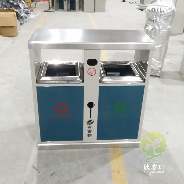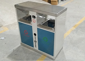 戶(hù)外小區(qū)雙分類(lèi)鋼制垃圾箱采用了優(yōu)質(zhì)的冷軋鋼板制作而成,可回收物、其他垃圾兩分類(lèi)方形雙面投口設(shè)計(jì),桶身采用了米白色和深藍(lán)色噴涂噴塑上色工藝,桶身雙面中下部位帶有害物和廢電池投口,中上部位雙面帶煙灰投口,絲網(wǎng)印刷了分類(lèi)標(biāo)識(shí)和有害物,投口精耕細(xì)作,抽拉式開(kāi)門(mén)取出內(nèi)筒。
