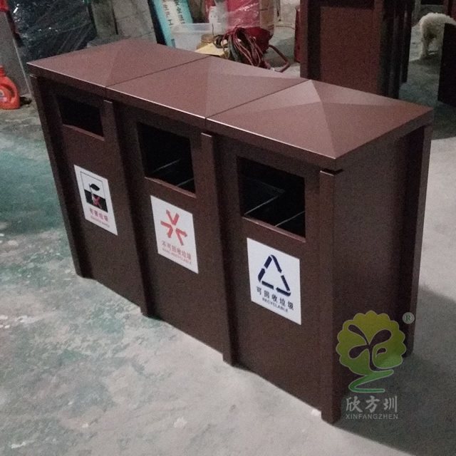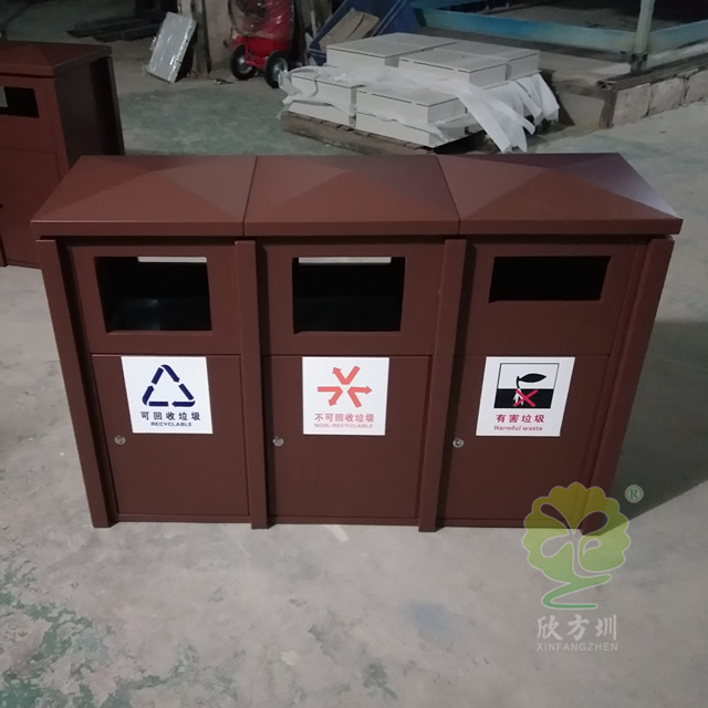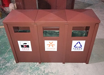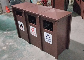 戶外大型噴塑三分類鋼板垃圾箱采用了全新冷軋鋼板料制作而成,經(jīng)過一系列的裁剪、折彎、焊接、打磨、噴塑、組裝等工序,桶身規(guī)格比較大采用了三分類可回收垃圾、不可回收垃圾、有害垃圾雙面單桶組合式無煙灰盅正面開門設(shè)計,桶身表面整體為噴塑咖啡色。